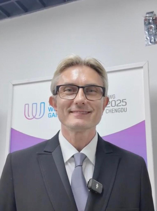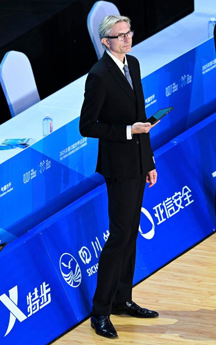 O juiz letão Sergejs Sinkins se tornou uma sensação inesperada na competição de dança esportiva dos Jogos Mundiais em Chengdu.