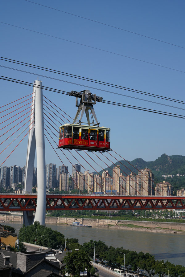 Um teleférico sobre o Rio Yangtze em Chongqing. (Foto: Xu Lin/China Daily)