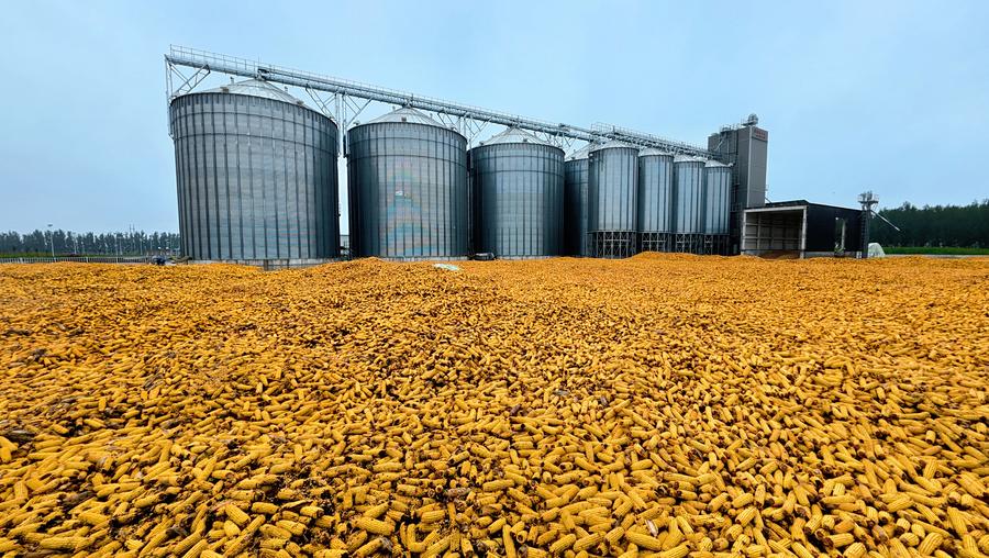 Instalações de secagem para milho na cidade de Dezhou, província de Shandong, no leste da China, em 9 de outubro de 2025. (Foto de Zhao Huhao/Xinhua)