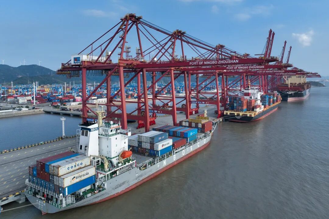 Operações de carga e descarga de contêineres no Terminal Dapukou do Porto de Zhoushan, em Ningbo. (Zou Xunyong/Xinhua)