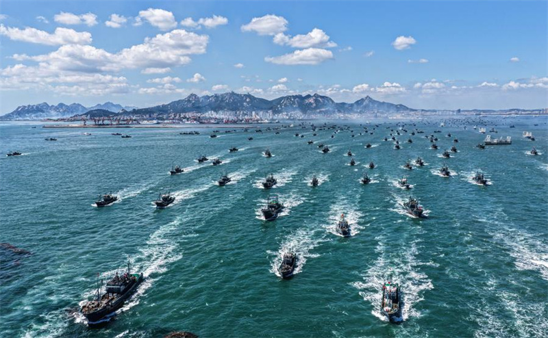 Vista aérea de barcos de pesca partindo após o fim da moratória da pesca nos mares Amarelo e Bohai, no porto de pesca de Shidao, na cidade de Rongcheng, província de Shandong, leste da China, em 1º de setembro de 2025. (Foto: Li Xinjun/Xinhua)