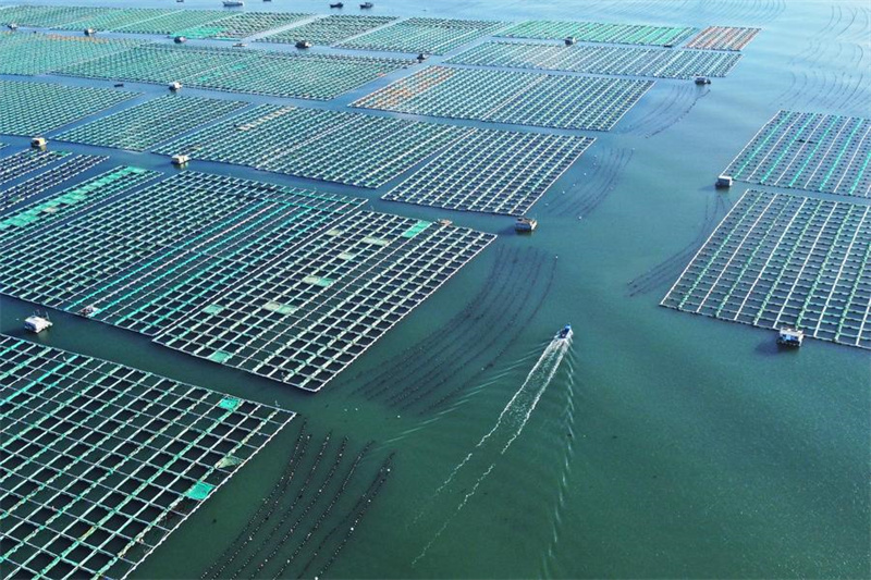 Vista aérea de uma área de criação numa fazenda marinha na cidade de Rongcheng, província de Shandong, leste da China, em 10 de novembro de 2025. (Foto: Wang Fudong/Xinhua)