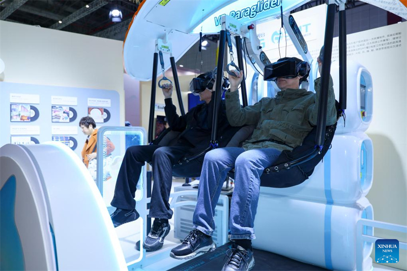 Visitantes experimentam dispositivos de realidade virtual numa área de exposição da província de Jiangsu, durante a 6ª Exposição Internacional das Indústrias Culturais do Delta do Rio Yangtzé, em Shanghai, no leste da China, em 20 de novembro de 2025. (Foto: Wang Xiang/Xinhua)