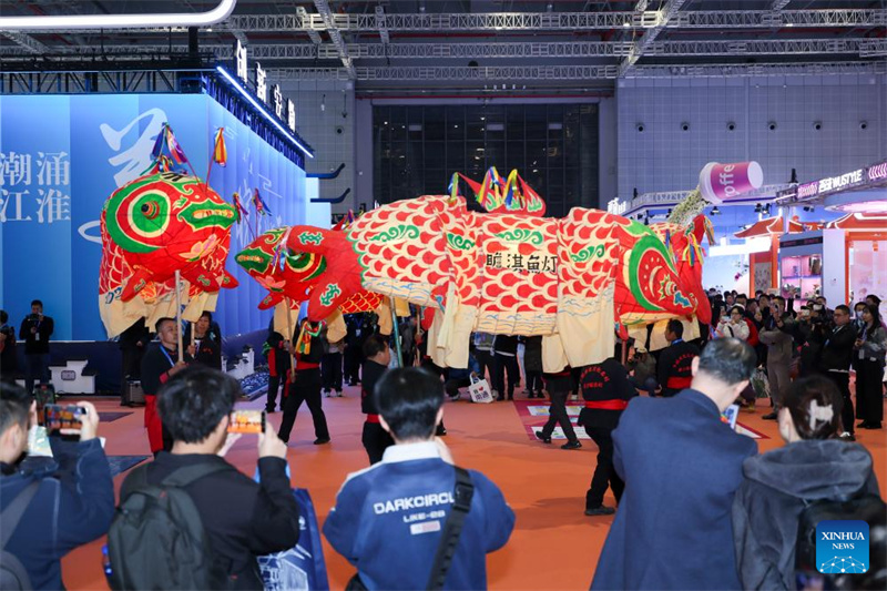 Visitantes assistem a uma apresentação de lanternas em forma de peixe de Zhanqi numa área de exposição da província de Jiangsu, durante a 6ª Exposição Internacional das Indústrias Culturais do Delta do Rio Yangtzé, em Shanghai, no leste da China, em 20 de novembro de 2025. (Foto: Wang Xiang/Xinhua)
