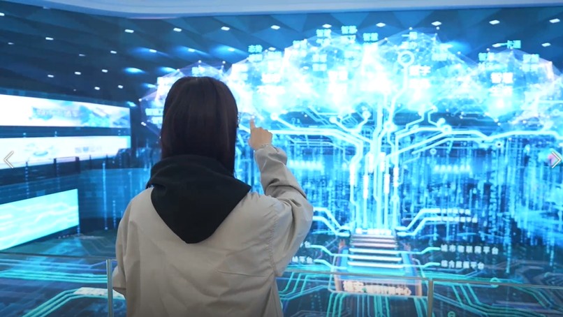 Numa grande tela no Centro de Computação Urbana de Xiong'an, fluxos de dados fornecem suporte computacional eficiente para as operações da cidade, fazendo do centro o núcleo neural da cidade inteligente.