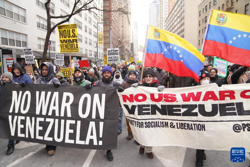 Em 3 de janeiro, quase mil pessoas participaram de uma manifestação e marcha na cidade de Nova York para protestar contra o ataque militar dos EUA contra a Venezuela. (Foto: Zhang Fengguo/Xinhua)