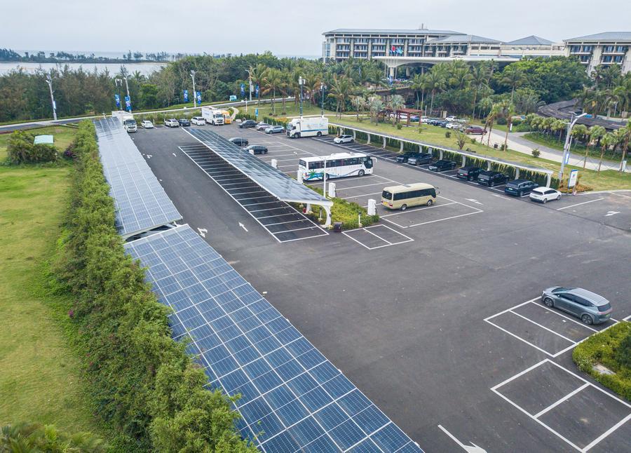 Vista aérea de dispositivos fotovoltaicos num estacionamento na zona de demonstração de carbono zero de Boao, na província de Hainan, no sul da China, em 16 de março de 2025. (Foto: Pu Xiaoxu/Xinhua)